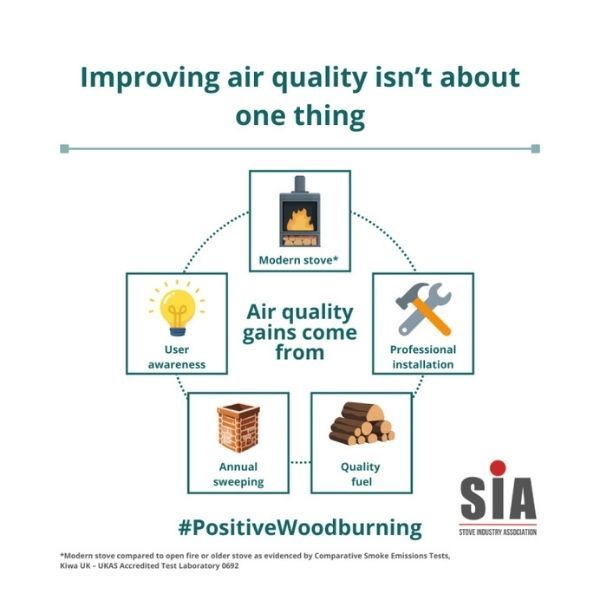 Each January, Clean Air Night prompts a renewed focus on air pollution and its impacts on health. This year’s campaign, taking place on 22nd January, has once again brought domestic burning into the spotlight. Air quality is an issue that matters deeply — and the Stove Industry Association (SIA) agrees that reducing emissions must remain a priority. But meaningful progress depends on recognising an important truth: not all wood burning is the same, and real-world emissions are shaped by a combination of technology, fuel quality, installation, maintenance and user behaviour. That’s why, alongside Clean Air Night, the SIA is launching a short, practical consumer-education campaign focused on what actually makes a difference – #PositiveWoodburning. Moving beyond oversimplification Much of the public debate around domestic burning tends to treat all appliances and all use as identical. In reality, emissions vary widely depending on: Over the past decade, the UK stove sector has undergone significant change. Open fires and very old appliances — which are the highest-emitting forms of domestic solid fuel use — are no longer representative of the products placed on the market today. Modern stoves must meet strict emissions and efficiency standards to comply with UK law, and manufacturers continue to invest heavily in improved combustion and performance. Understanding air quality in context It is also important to recognise that domestic wood burning is not the sole cause of poor air quality in the UK, nor is it responsible for all particulate pollution experienced in towns and cities. Air pollution comes from a wide range of sources, including: Levels of air pollution also vary significantly depending on location, weather conditions, population density and time of year. Domestic wood burning is one contributor within this wider picture, which is why effective policy and public discussion must be proportionate and evidence-led, focusing on the sources, technologies and behaviours where the greatest improvements can be achieved. Treating all air quality challenges as the result of a single activity risks oversimplifying a complex issue — and can divert attention away from practical, targeted measures that are already delivering emissions reductions in the real world. Why consumer behaviour matters Regulation alone is not enough. How people use their appliances matters too. Independent data shows that poor fuel quality, incorrect lighting techniques, over-loading, slumbering stoves and lack of maintenance can all significantly increase emissions. The SIA’s focus, therefore, is not on denying air-quality concerns, but on helping households reduce emissions in practice through better choices and better use. Encouragingly, official statistics already show progress: emissions of PM2.5 and PM10 from domestic combustion fell by 17% between 2020 and 2023, reflecting a combination of regulation, product innovation and improved awareness. (Source: www.gov.uk/government/statistics/emissions-of-air-pollutants/emissions-of-air-pollutants-in-the-uk-summary) This progress demonstrates that change works when it is targeted and evidence-led. What the SIA campaign focuses on Running between 15th and 25th January, the SIA’s #PositiveWoodburning campaign highlights five areas where households can make a tangible difference: Together, these measures represent practical, achievable steps that can significantly reduce emissions associated with domestic wood burning. A regulated, forward-looking sector The UK stove industry is already one of the most tightly regulated domestic heating sectors, and it continues to evolve. Emissions limits have tightened, testing requirements have increased, and manufacturers are actively developing the next generation of appliances. This winter, the SIA’s message is simple: Air quality matters. How we burn matters too. Improving air quality is not about oversimplifying complex issues or framing households as the problem. It is about supporting informed choices, proportionate policy, and continued progress — all of which are essential if emissions reductions are to be sustained. Call to action Households looking for advice on improving how they burn should speak to their local stove retailer or chimney sweep, and follow manufacturer guidance and fuel standards. By focusing on evidence, education and best practice, we can continue to make real, measurable improvements to air quality — not just on Clean Air Night, but all year round. Article and images courtesy of the Stove Industry Association (SIA).